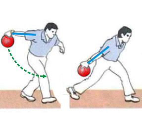 La boule commence à redescendre par son propre poids en souplesse. Le bras gauche légèrement écarté du corps sert de stabilisateur. Le buste continue son inclinaison et les genoux continuent leur flexion progressive. Le pied gauche conserve la pointe au sol afin d'entamer la glisse.